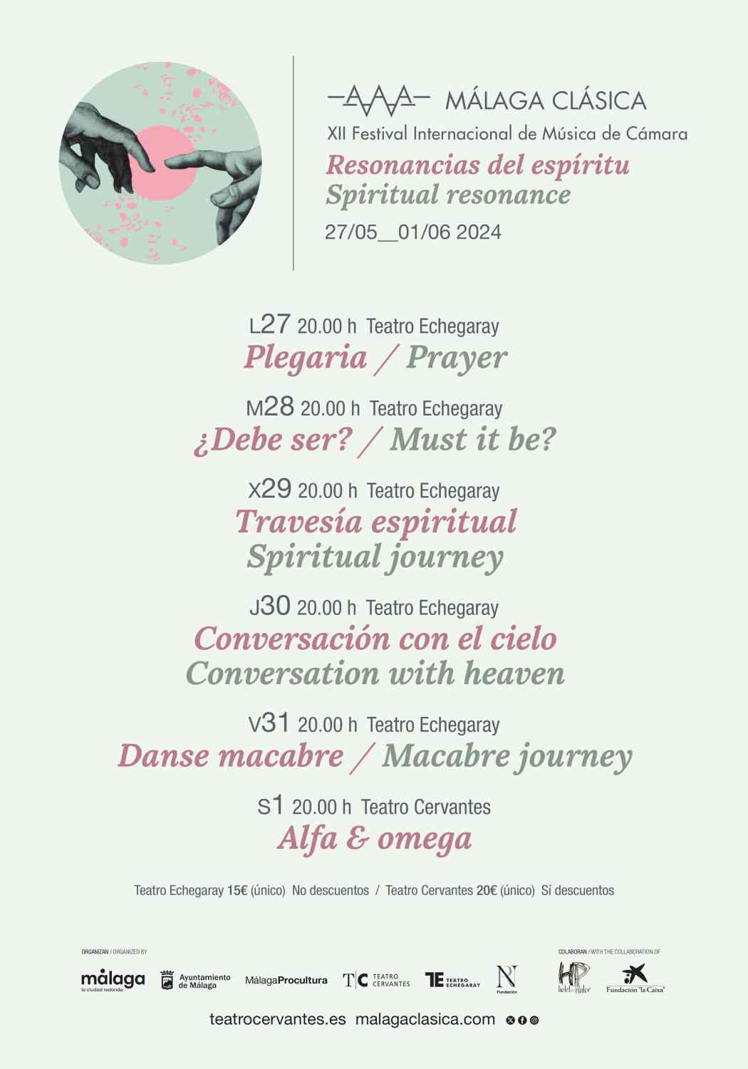 Además de los compositores citados anteriormente, las Resonancias del espíritu visitan asimismo en la primavera malagueña la obra de William Gómez, Smetana, Bruch y Bloch, en una semana en la que se indagará sobre el destino y la libertad, sobre la vida y la muerte o sobre la naturaleza cíclica de la música. Reina y Nilsen han escogido un elenco de jóvenes y reconocidos instrumentistas provenientes de España, Francia, Japón, Bulgaria, Rumanía, Noruega, Suecia y Rusia. Los violinistas Clemence de Forceville, Nicolas Dautricourt y Laura Romero Alba (los dos últimos, también violas); los violas Razvan Popovic y Tomoko Akasaka; los violonchelistas Øyvind Gimse, Per Nyström y Gabriel Ureña; los pianistas Natalia Kucháeva y Josu de Solaun, y el organista Antonio del Pino acompañarán a los codirectores de Málaga Clásica en las seis veladas.