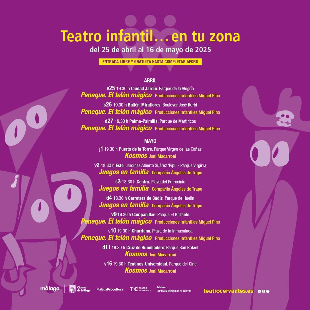Las nuevas y mágicas aventuras de nuestro títere más universal, Peneque. El telón mágico, la instalación interactiva de la Compañía Ángeles de Trapo y sus Juegos en familia y los malabares y magia del Kosmos de Joni Macarroni visitarán los fines de semana entre el 25 de abril y el 16 de mayo todos los distritos de Málaga. La nueva edición de Teatro Infantil… en tu zona, un programa organizado por el Teatro Cervantes con la colaboración de las juntas municipales de Distrito para completar la oferta escénica dirigida a los más pequeños y su familia, propone esta primavera once citas al aire libre y con acceso gratuito hasta completar aforo. El cartel pone así el broche en las calles a la programación del ciclo de Teatro Infantil, que aún ofrece entre este mes de marzo y el de abril cuatro espectáculos en el Teatro Echegaray.